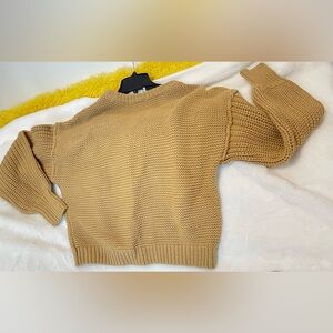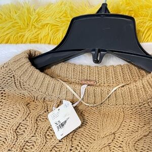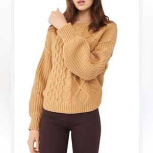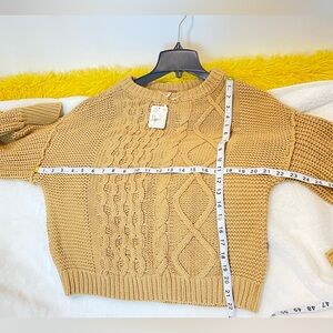 Cozy cable knit design. Warm camel hue. Ideal for layering.