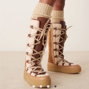 Stay warm and stylish with these brown and cream winter boots. Perfect for cold weather, these boots offer comfort and fashion in one.