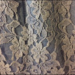 Strapless dress. Periwinkle/blue/purple ish color. Lace all over. More detailed lace on bust. Zipper back