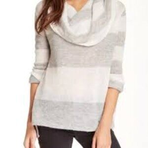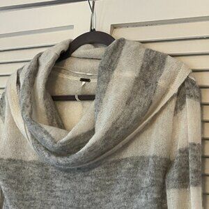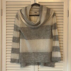 Free People women's striped cowlneck sweater top, size small. Light grey and white. Alpaca blend. Thin, lightweight fabric, slightly sheer. Gently worn, in very good used condition. Very light pilling/signs of wear. No rips or stains. See photos.