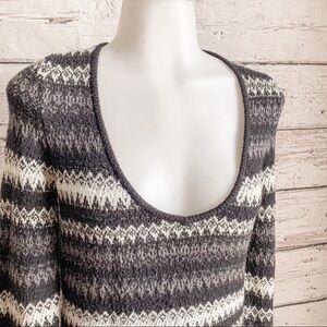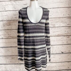 Free People striped tunic sweater. Cute form fitting tunic with grey, blue, black and white stripes. Form fitting to pair with leggings or skinny jeans.