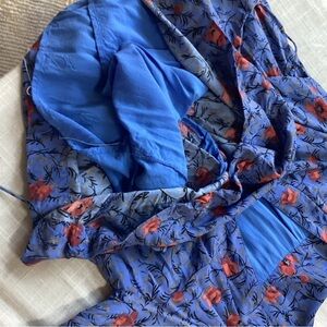 This lovely Free People top in a vibrant blue color features a flattering deep V-neckline, three-quarter length sleeves, and a relaxed fit for both comfort and style. The top is perfect for casual outings or dressed up with accessories for a night out. Lined. Empire waist pull over style with tie back. Beautiful shade of blue with burnt orange flowers. Romantic and flowy. Excellent condition. Size tag is missing but looks to be a S-M depending on desired fit. Please confirm measurements approximate laying flat in pictures as Poshmark does not accept returns for fit issues. Please see all ten photos provided.