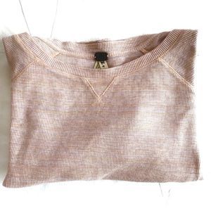Free people thermal top features billowy fit and 3/4 sleeves. Tags reads lavender but definitely more of a Blush with taupe colors. Soft & cozy. Bust 44”, length 24”. Cotton.