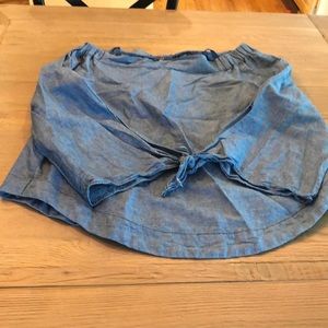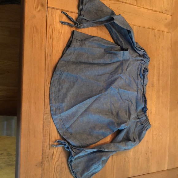 Off the shoulder top, bell sleeve with small open cut sleeve hem with tie. Chambray color. Used,