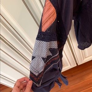 barely worn, navy deep v top. Navy lace detailing with colorful patches on the sleeve.