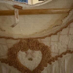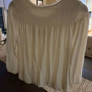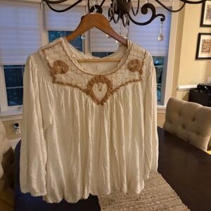 Cream colored with embroidered design. Contemporary! great with jeans. Runs big for XS (like most Free People) more like a small/medium