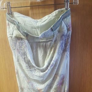 Mid length and drapey, beautiful shade of light jade green with floral and beading accents. Really gorgeous top. Open back, worn once.