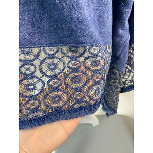 Free People brand women's size XS blue cream oversized poncho pullover. In good pre-owned condition, light wear. Cowl neck with boho lace panels throughout. Poncho style "sleeves" has an oversized fit.