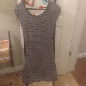 Wore this twice years ago and haven't in year. The last picture shows the texture of this dress best. It's a woven black and grey patterned fitted dress with a slight flare at the bottom. XS/stretches to be a S.