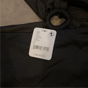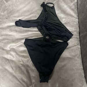 Features: Soft, stretchy fabrication, gathered detailing at front, side cutouts, adjustable tie at shoulder, high-cut legs, open-back style