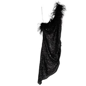 Amanda Uprichard Kieran Dress in Sequin Black. Features a midi bias cut silhouette, pull over styling, one-shoulder detail, sequins throughout, feather trim, fully lined. 100% polyester 100% ostrich feather trim. New with tags with markings at brand label to prevent retail returns. Style number SE-22125
