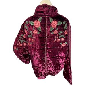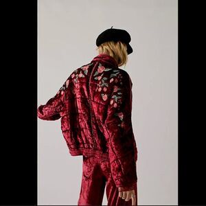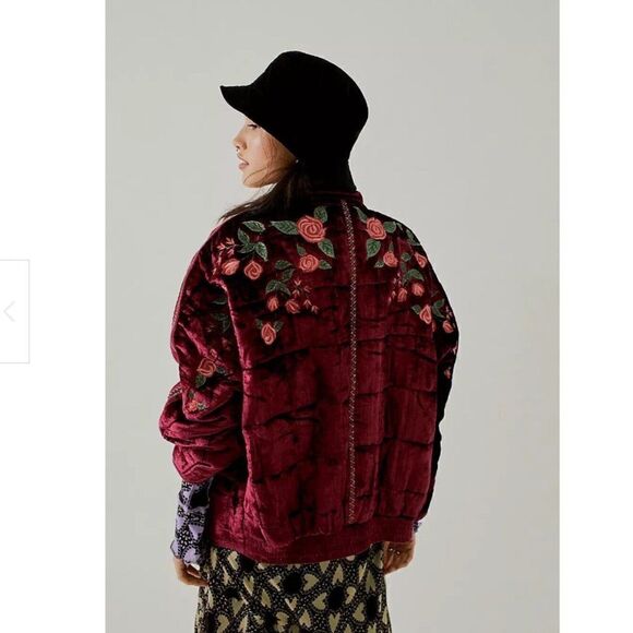 New Free People x Anna Sui Rose Garden Red Velvet Dolman Quilted Embroidered Bomber Jacket