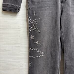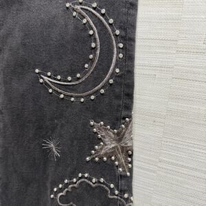 Front zip closure, pouch pockets throughout, stretch denim fabrication, bold celestial-shaped embroidery and embellishment throughout