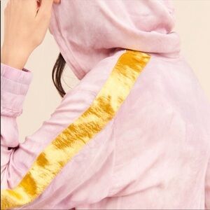 Pink tye die with contrasting gold down the sleeve. Side pockets. Elastic waist.