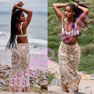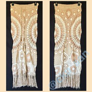 Sold by Free People: Adorable Flook Natalia Pieced Crochet Skirt neutral in size Small. Turn heads in this so special skirt from Flook is featured in a high-rise crochet design with exaggerated fringe trim at the bottom for added dimension. Elastic waistband with drawstring, pull-on style, high-rise, maxi silhouette, mini-skirt lined. This product was consciously made to reduce the footprint and supports Free People's mission to be a little better every day. Perfect for summer or your next vacation. Excellent condition. Please see pictures for details, fabric content, condition & measurements, since they are part of the description. Sold out in stores for years. Open to trade for a larger size and different color. Reasonable offers welcome.