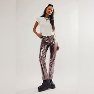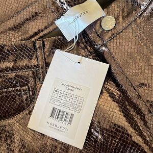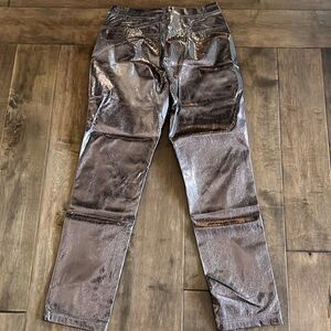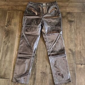 Features: Zip fly and button closure, five-pocket design, faux croc fabrication with metallic finish