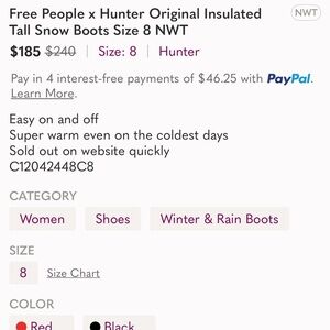 Free People x Hunter Original Insulated Tall Snow Boots Size 10 NWT
