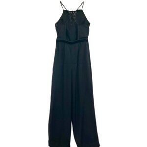 • Features: Lace inset bodice, tuxedo-inspired waistband, halter neckline, strappy open back, wide-leg fit