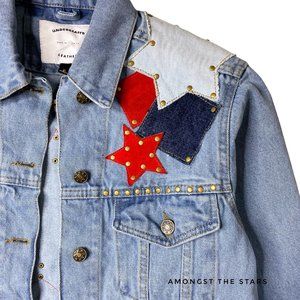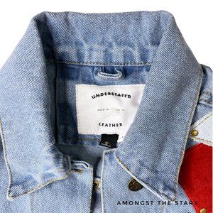 Brand new WITHOUT tags, Women's size Small. This Free People x Understated Leather Lone Star Studded Blue Denim Jean Jacket is so unique! This western, inspired denim jacket has red star & square patches all over in genuine suede leather and denim. Love the gold stud accents! Has 2 buttoned, chest & 2 slide in pockets. Love the vintage, retro 80's and 90's vibes! Button closure.