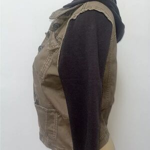 Stylish women's jacket featuring a unique two-tone design with a comfortable hoodie. Perfect for casual outings.