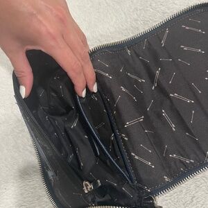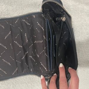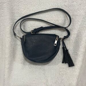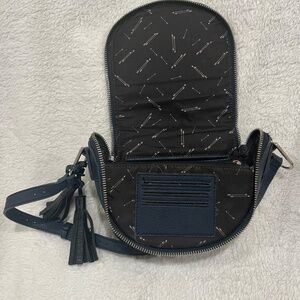 The perfect little purse! Dark blue with silver buckles and zipper. Adjustable strap. Inside, it has an open pocket, a zip pocket, and three card slots. Measures about 8” wide, 7” tall.