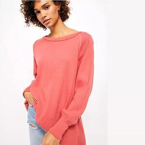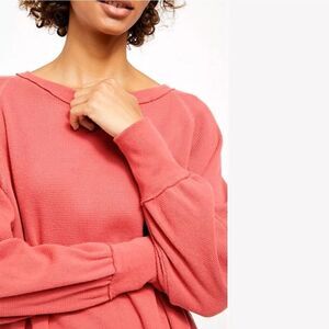 Long sleeve waffle knit thermal tee with split back hem and oversized fit.