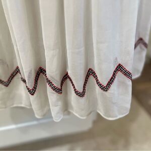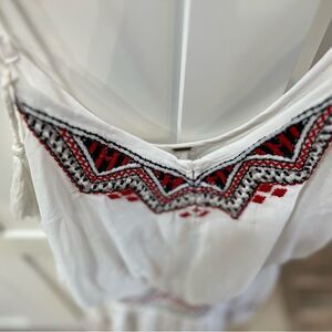 Stylish white romper featuring bold red and black embroidery. Ideal for any event. Very Stylish!