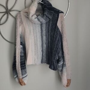 This Free People sweater is too cute...worn once. Cowl neck cropped style. Copper color metallic thread on sleeves... perfect on one side, looser threads on the other side see pics. Size XS . Retail $128.