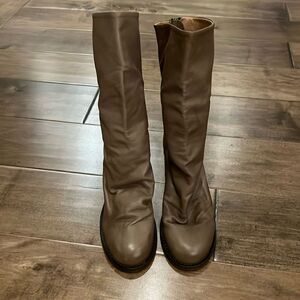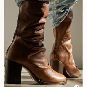 Slouchy leather boot featuring distressed details and a high stacked heel.