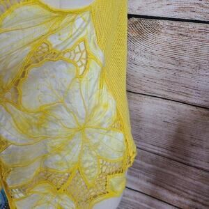 Free People Embellished Knit Lace Tank. Gorgeous beading on front of tank accompanied with bronze sequins. Delicate knit straps. Lace crochet detail back with patchwork white and yellow flowers. Partial flyaway back. Racerback. Size Small. Excellent Used Condition. Front: 55% Linen; 45% Cotton | 60% Polyester; 40% Cotton.
