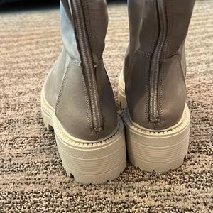 Features: Mid-calf length, leather fabrication, rubber tread platform, chunky heel, round toe, ruched detailing, back zipper closure