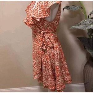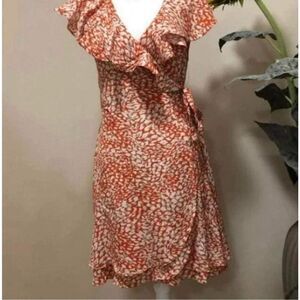 Pretty and femme, this printed wrap dress features ruffle details along the neckline and a tie at the waist.