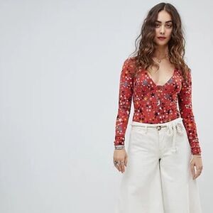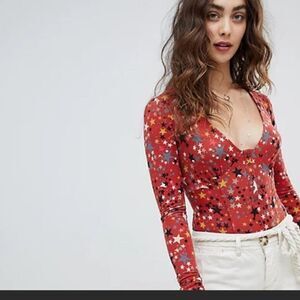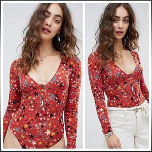 Free People Girls Like Us Red Star Print Button Up Long Sleeve Bodysuit