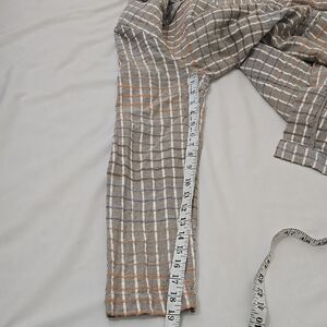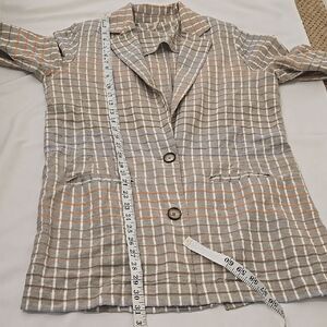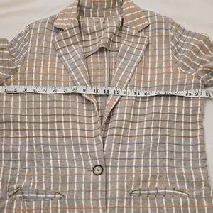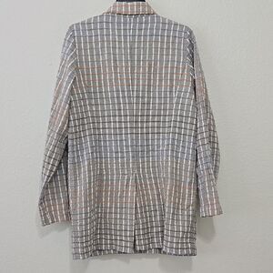 This elegant blazer showcases a striking plaid pattern in gray and tan, perfect for adding a touch of sophistication to any outfit. Its longer mid-thigh length and structured silhouette make it a versatile choice for various occasions. Good pre-owned condition.
