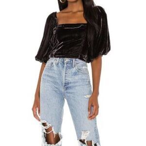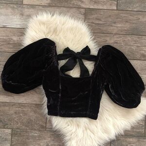 Free People Gray Marie Velvet Open Back Top size XS. Poly blend. Back tie closure. Padded shoulders. Velvet fabric. Puff sleeves. Very dark Gray. Brand new with sample tag attached internally. No flaws. Smoke-free. Fast Shipper.