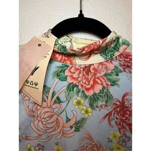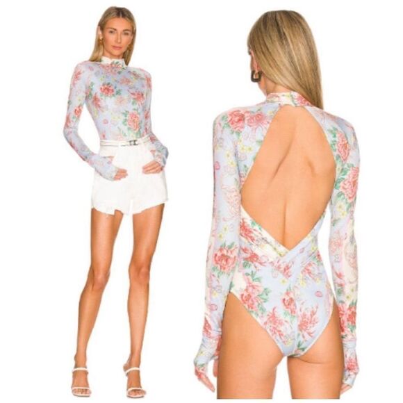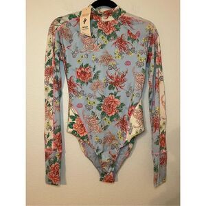 Gloves Off Bodysuit in Kyoto Kimono & French Blue by We Are HAH ~ New, no flaws Details: Pull-on styling. Mockneck styling with back loop button closure. Back cut-out. Thumbhole design. Fabric made of cornstarch. Certified UV protection. Jersey fabric. Revolve Style No. HHER-WS45. Color: Kyoto Kimono & French Blue Length: 26.5"