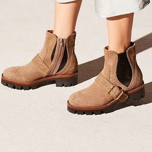 In excellent condition small scuffs leather boots with chunky platform heels. Free People collab X Jeffrey Campbell. Comes with box. Suede snakeskin embossed boot with rugged chunky rubber sole, gold toned studs and statement buckle. Side zip with elastic insets for easy fit at ankle. Shaft height: 6" heel: 2" platform: 1"