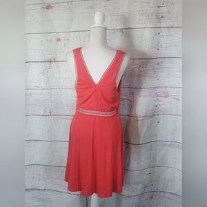 Sleeveless Hibiscus color (reddish orange) ribbed knit dress with lace detailing. A line with side zip closure. In great condition.