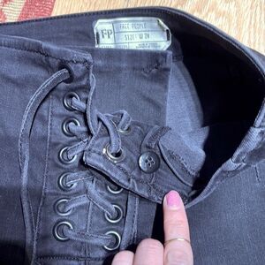 Free People size 24, washed black lace-up skinny jeans. There is a flap and extra button closure behind lace-up detail. High-rise, skinny fit with some stretch. Good condition. No stains or tears.