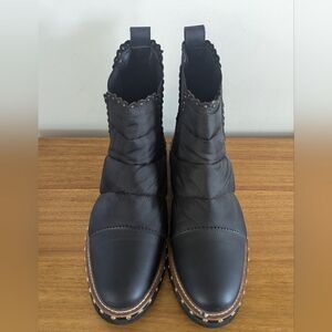 Description: Free People Atlas Puffer Leather-Trim Studded Whimsigoth Boho Dark Academia Maximalist Chelsea Boot 39 / 9 discrete flaw in the stitching of the front toe - photo included - but she's in great overall condition, gold-tone hardware with studded trim along the soles and insets, pull tabs on the back, scalloped detail, elasticized slip-on style, lightly padded insole, minimal wear on the soles, ships without box