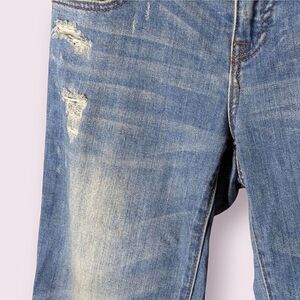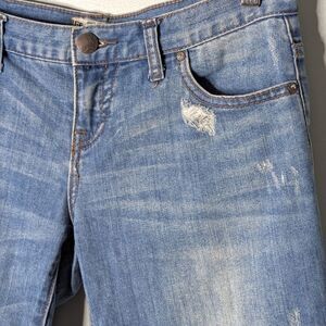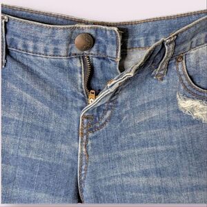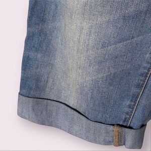 All aboard the long shorts train! These stretchy, forgiving jean shorts feature a long inseam and just enough distressing. Nice deep back yoke will flatter your bum and the cuffed hems help dress them up enough for casual Fridays with a blazer and wedges. Medium wash with strategic fading. Excellent used condition.