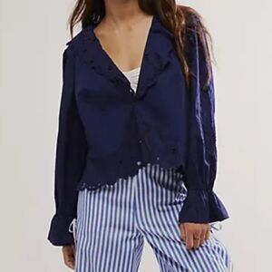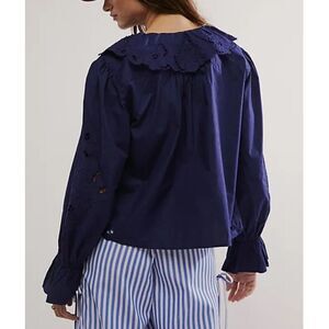 Turn heads in this timeless top featured in a button-front silhouette with exaggerated collar, lace detailing throughout, and slightly defined shoulders for added shape.