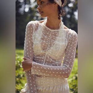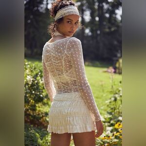 Features: Sheer mesh fabrication, boat neckline, long fitted sleeves, lettuce-edge trim, ruched detailing, embroidered daisies throughout