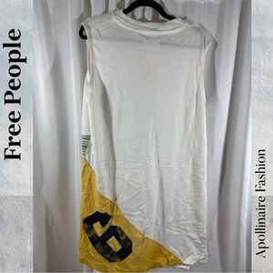 Vibrant tunic with bold graphic design. Features a mix of white, yellow, and blue accents. Perfect for a casual look.