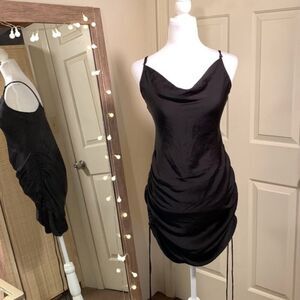 Easily transition from day to night in this sultry and slinky slip dress teatures adjustable ruched sides that allow you to wear it long or short.