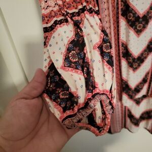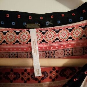 Navy blue with blue and red abstract print boho dress. It's longer on the back, and shorter on the front. Hook top front closure. Long baloon style sleeves. Pre-owned in excellent condition.