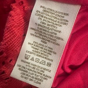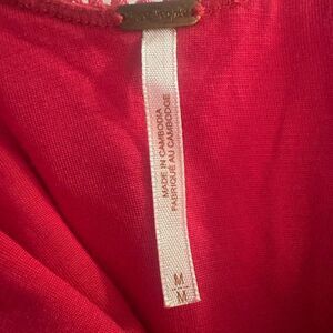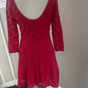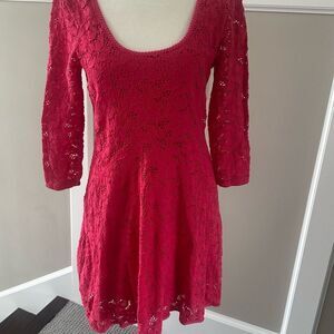 This stunning crimson orange lace dress by Free People features a flattering fit and flare silhouette with a scoop neckline and 3/4 sleeves. The vibrant color and intricate lace pattern make it an ideal choice for a night out or cocktail event. L 32” x W 16” pit to pit.
