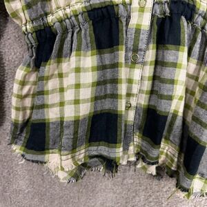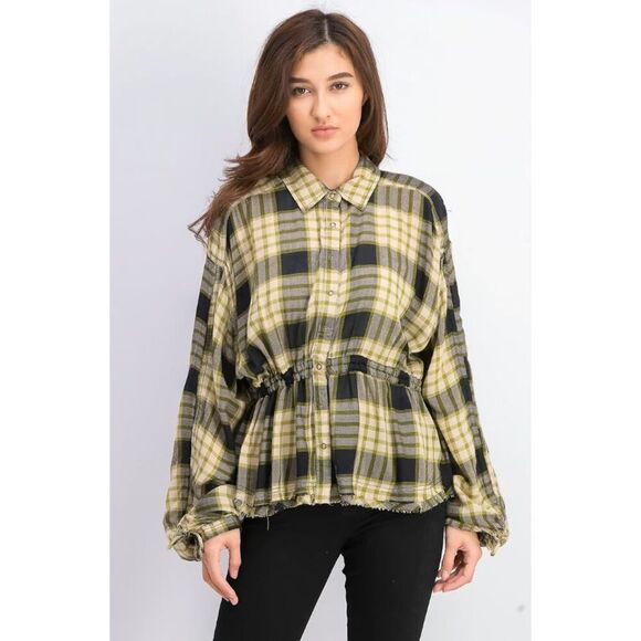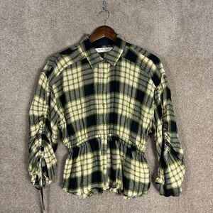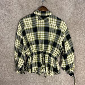 Free People Pacific Dawn Shirt, Plaid pattern, Ruched long sleeve, Snap front closure, Collared, Frayed hem, Drawstring waist, 83% Viscose/17% WoolWomen's Size XS