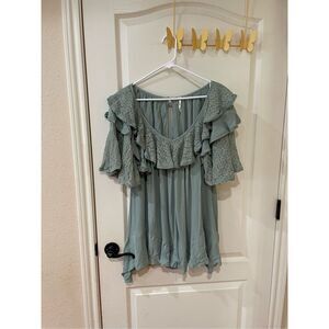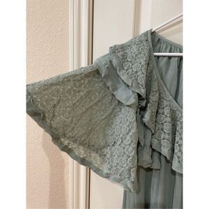 Features: V-neckline with ruffle trimming, draped crochet lace sleeves, ruffle trim at the shorts, back button closure