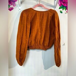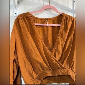 This chic blouse from Free People features a stylish wrap-front design and long, billowy sleeves. Crafted in a warm brown hue, the cropped silhouette and ruched details add a touch of bohemian flair to your wardrobe.